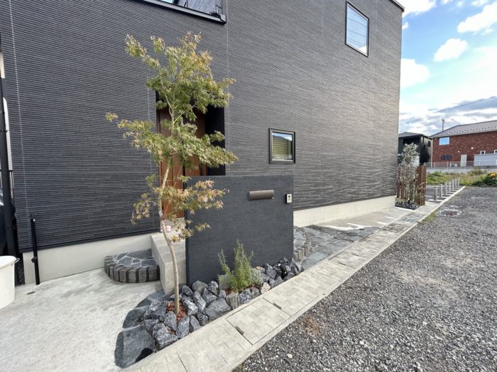黒色の中に植栽のグリーンが映え、これからの紅葉シーズンも楽しみになる玄関